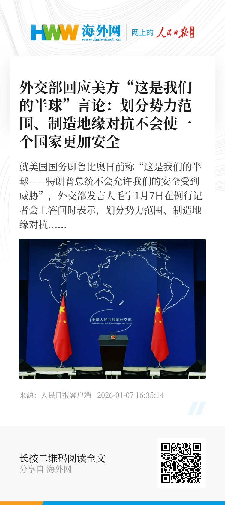 就美国国务卿鲁比奥日前称“这是我们的半球——特朗普总统不会允许我们的安全受到威胁”,外交部发言人毛宁1月7日在例行记者会上答问时表示,划分势力范围、制造地缘对抗,不会使一个国家更加安全,更不会给世界带来和平,共同安全、合作安全才是可持续的安全。