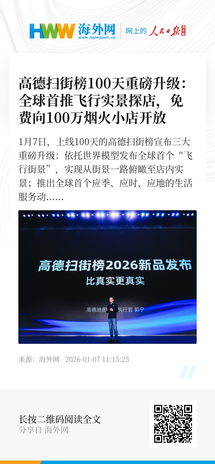 高德还宣布免费为100万烟火小店接入飞行街景,高德CEO郭宁表示:“高德扫街榜通过与物理世界持续交互,不断实现自我进化,将更好地呈现10亿用户的真实选择,持续应用最前沿的科技服务最真实的人间烟火。”