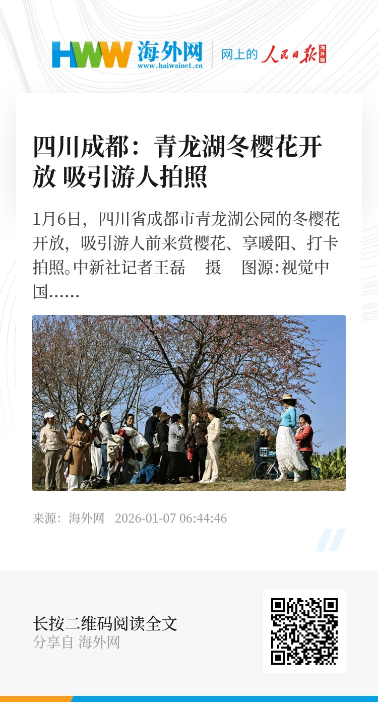 32921653,.四川成都:青龙湖冬樱花开放 吸引游人拍照,.2026-01-07 06:44:46,.204441,.张荣耀、卢思宇