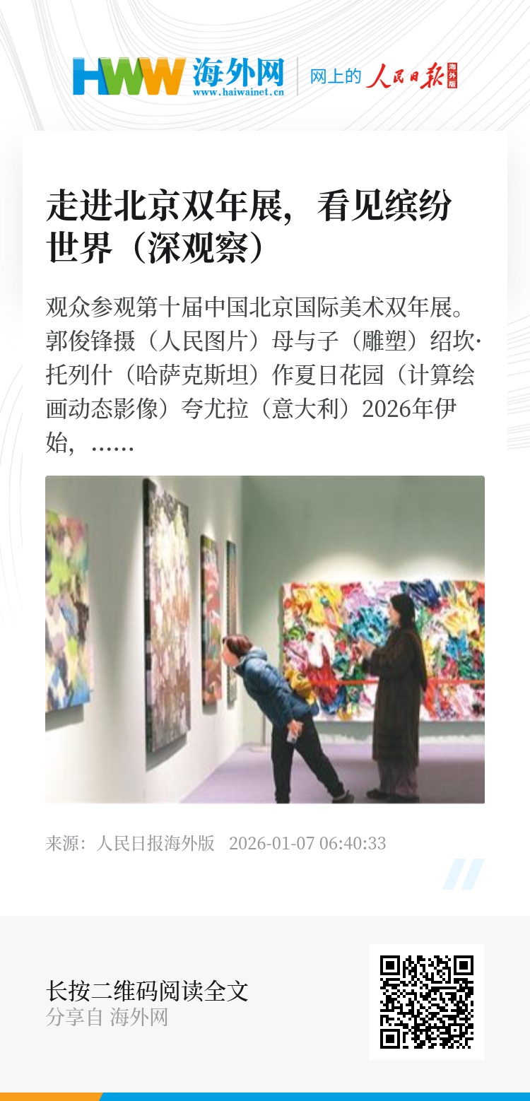 2026年伊始,北京迎来一场备受瞩目的国际艺术盛会——第十届中国北京国际美术双年展日前在北京展览馆举办。本届双年展由中国文联、北京市委宣传部、中国美术家协会联合主办,汇聚近120个国家和地区的近600件当代美术作品,聚焦和平发展、生态文明、科技伦理等话题,以视觉艺术语言讲述北京故事、中国故事与世界故事。