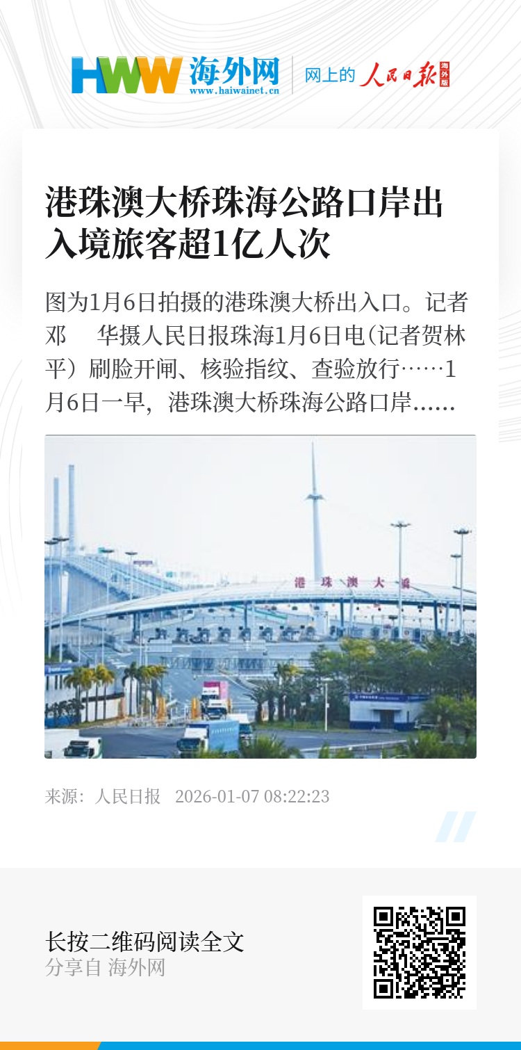 人民日报珠海1月6日电(记者贺林平)刷脸开闸、核验指纹、查验放行……1月6日一早,港珠澳大桥珠海公路口岸珠港旅检大厅客流涌动。据港珠澳大桥边检站统计:截至当日8时许,经港珠澳大桥珠海公路口岸往来粤港澳三地的旅客数量累计已突破1亿人次。