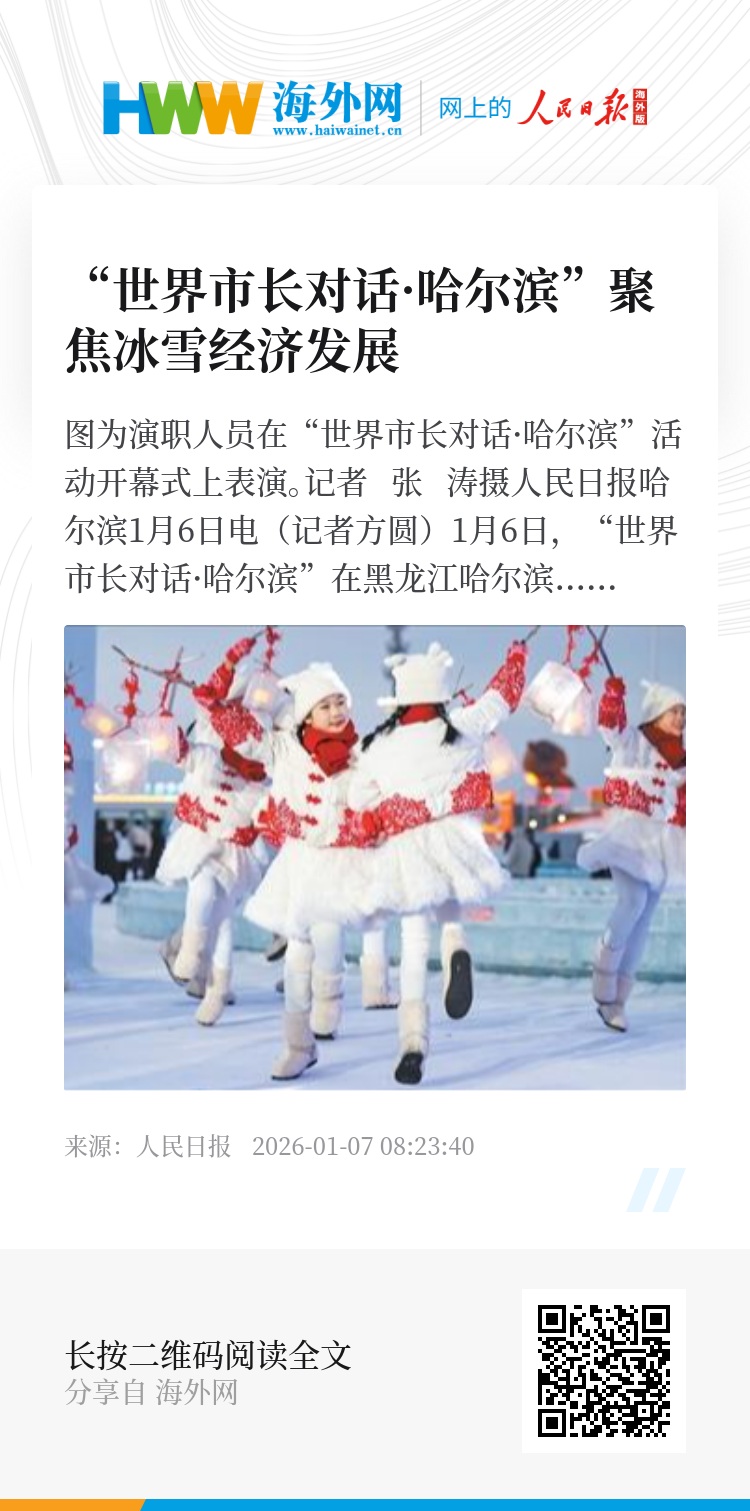 人民日报哈尔滨1月6日电(记者方圆)1月6日,“世界市长对话·哈尔滨”在黑龙江哈尔滨开幕。活动以“冰雪连接世界 合作共赢未来”为主题,来自加拿大、芬兰、德国、希腊、韩国、泰国、土耳其、中国等国家的城市市长、副市长及市长代表参会,深入交流发展冰雪经济的实践做法。