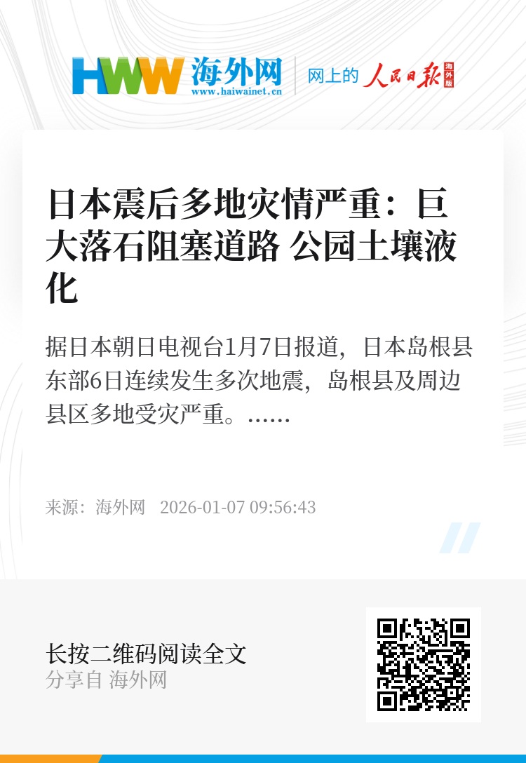 海外网1月7日电 据日本朝日电视台1月7日报道,日本岛根县东部6日连续发生多次地震,岛根县及鸟取县多地受灾严重。