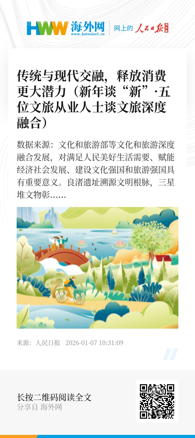 文化和旅游深度融合发展,对满足人民美好生活需要、赋能经济社会发展、建设文化强国和旅游强国具有重要意义。良渚遗址溯源文明根脉,三星堆文物彰显古蜀瑰丽,英歌舞、簪花围等非遗焕发新生……一系列文旅深度融合发展的鲜活实践,勾勒出“诗和远方”相得益彰、浑然一体的蓬勃图景,更好地满足了人民群众对美好生活的期待。