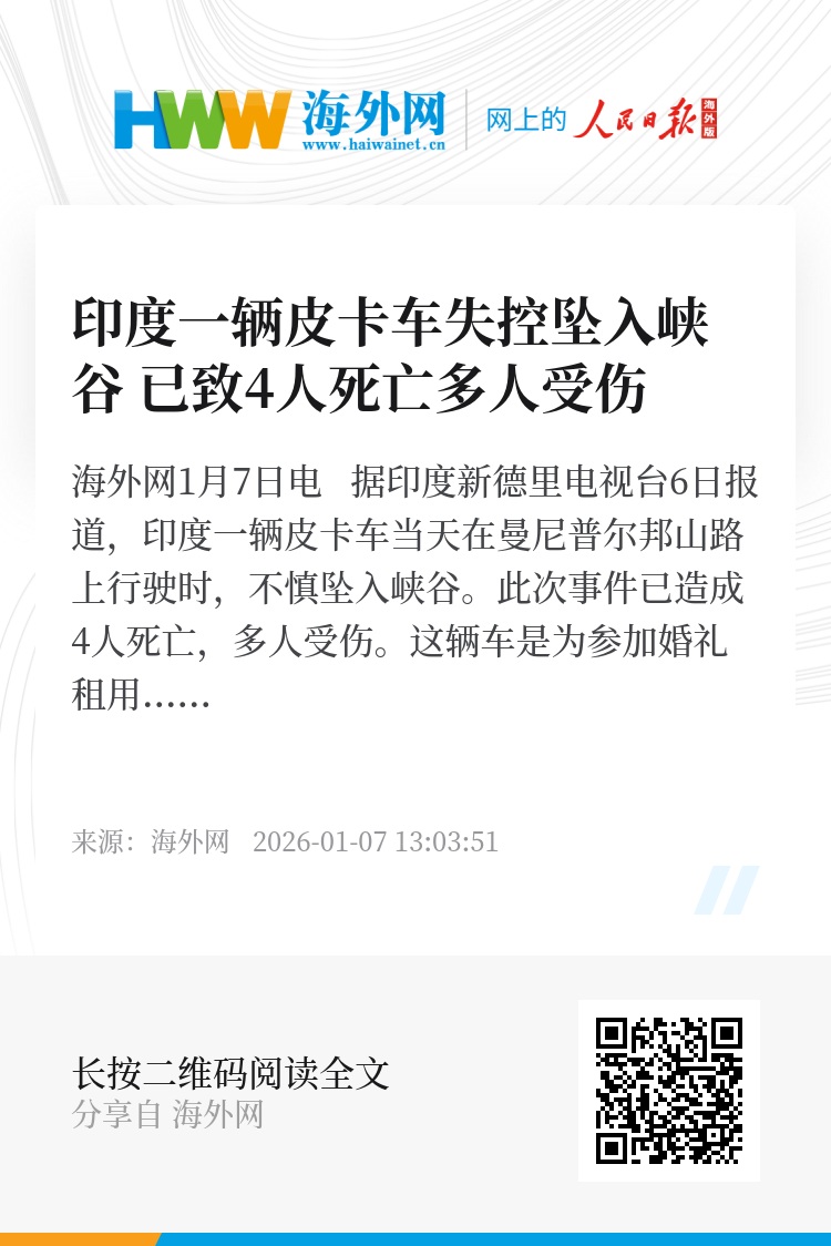 海外网1月7日电 据印度新德里电视台6日报道,印度一辆皮卡车当天在曼尼普尔邦山路上行驶时,不慎坠入峡谷。此次事件已造成4人死亡,多人受伤。