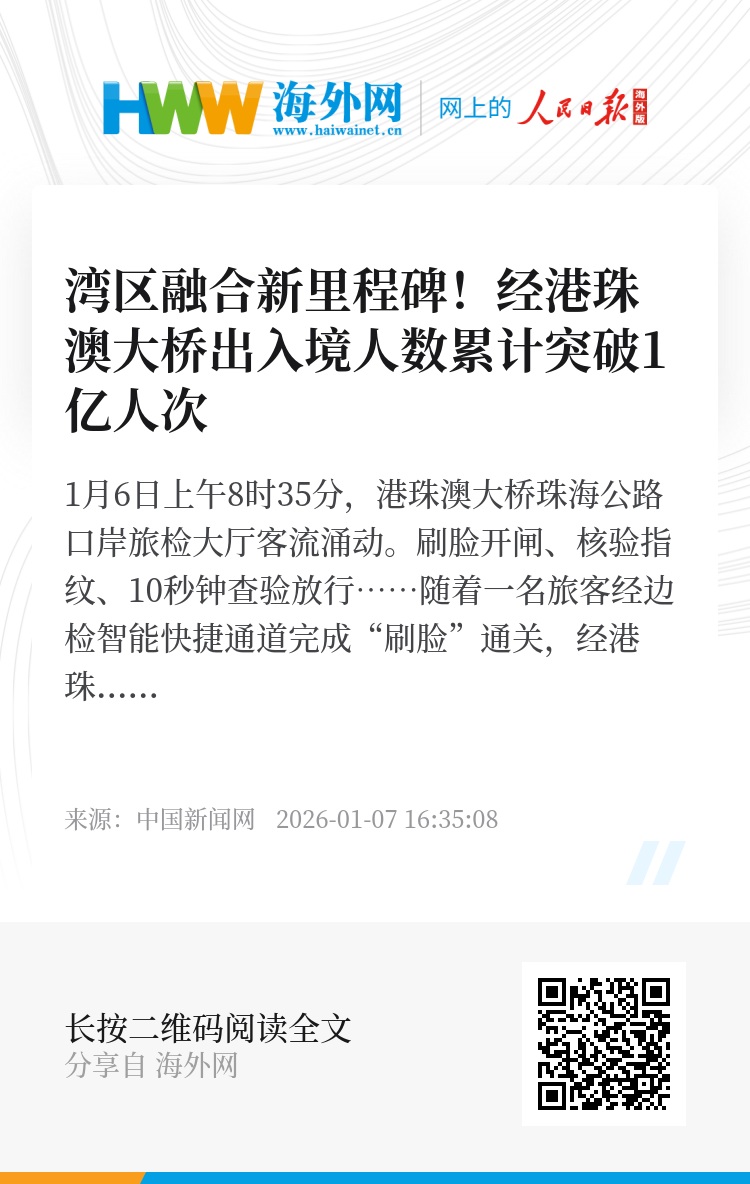 1月6日上午8时35分,港珠澳大桥珠海公路口岸旅检大厅客流涌动。刷脸开闸、核验指纹、10秒钟查验放行……随着一名旅客经边检智能快捷通道完成“刷脸”通关,经港珠澳大桥珠海公路口岸往来粤港澳三地的旅客数量正式突破1亿人次。车畅人旺的港珠澳大桥,正成为粤港澳三地同心同行、融合发展的生动写照。