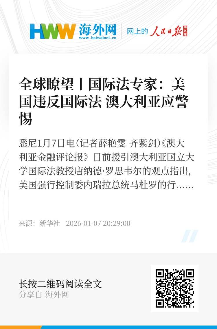 新华社悉尼1月7日电(记者薛艳雯 齐紫剑)《澳大利亚金融评论报》日前援引澳大利亚国立大学国际法教授唐纳德·罗思韦尔的观点指出,美国强行控制委内瑞拉总统马杜罗的行为违反国际法,澳大利亚应“保持警惕”。文章摘要如下:
