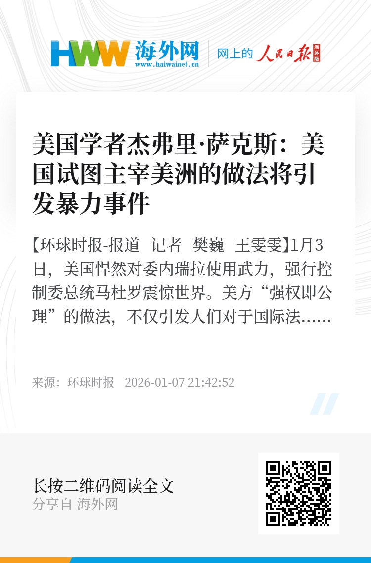 【环球时报-环球网报道 记者 樊巍 王雯雯】1月3日,美国悍然对委内瑞拉使用武力,强行控制委总统马杜罗震惊世界。美方“强权即公理”的做法,不仅引发人们对于国际法治失效的思考,也引发人们对“门罗主义”回归的担忧。美国著名学者、哥伦比亚大学可持续发展中心主任杰弗里·萨克斯5日在接受《环球时报》记者独家专访时表示,不论是“门罗主义”还是“罗斯福推论”,都没有当下“新门罗主义”这么粗鲁和暴力。美国试图主宰美洲的做法将引发大量暴力事件。