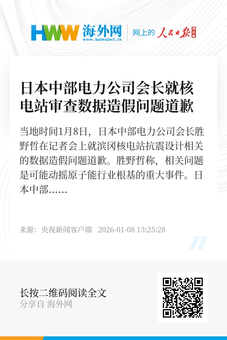 当地时间1月8日,日本中部电力公司会长胜野哲在记者会上就滨冈核电站抗震设计相关的数据造假问题道歉。胜野哲称,相关问题是可能动摇原子能行业根基的重大事件。