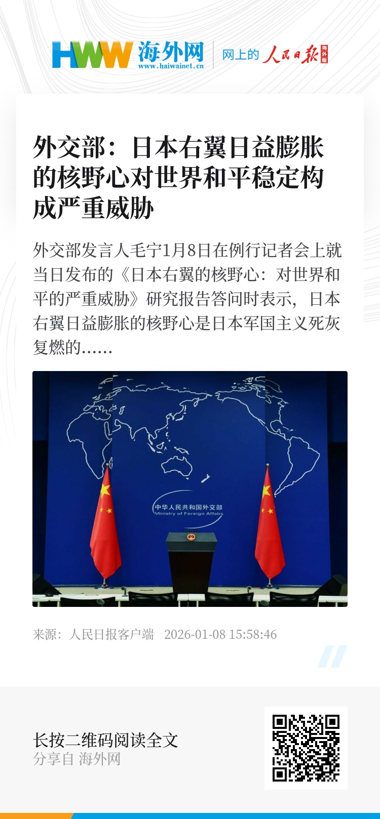 外交部发言人毛宁1月8日在例行记者会上就当日发布的《日本右翼的核野心:对世界和平的严重威胁》研究报告答问时表示,日本右翼日益膨胀的核野心是日本军国主义死灰复燃的危险信号,对世界和平与稳定构成严重威胁。日方应当正视国际社会的正义呼声,立即澄清在核武器问题上的立场,恪守《不扩散核武器条约》义务及“无核三原则”。