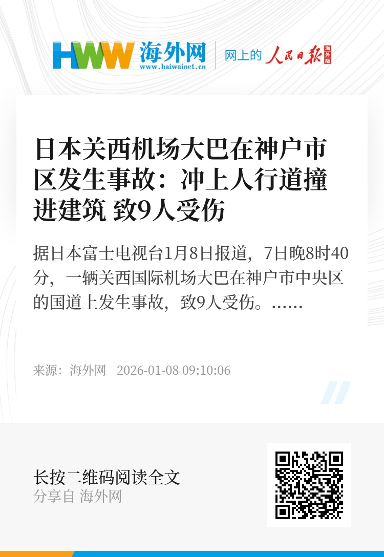 海外网1月8日电 据日本富士电视台1月8日报道,7日晚8时40分,一辆关西国际机场大巴在神户市中央区的国道上发生事故,致9人受伤。