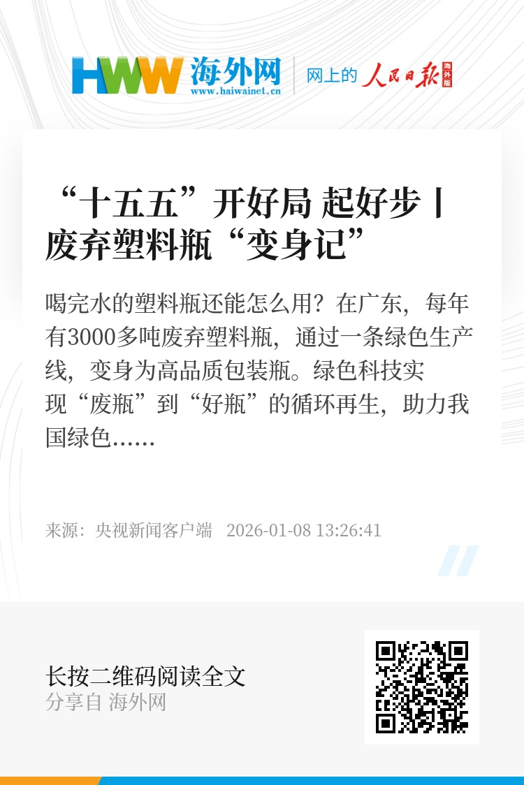 喝完水的塑料瓶还能怎么用?在广东,每年有3000多吨废弃塑料瓶,通过一条绿色生产线,变身为高品质包装瓶。绿色科技实现“废瓶”到“好瓶”的循环再生,助力我国绿色产品“卖全球”。