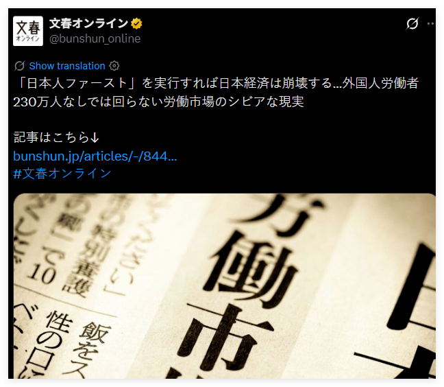 近日,安田在日本媒体“文春在线”上表达了这一观点,称一旦在“日本人优先”的口号下,拿230万在日外籍劳工开刀,那么日本的劳动力市场将无法运转,整个经济也将随之崩溃。