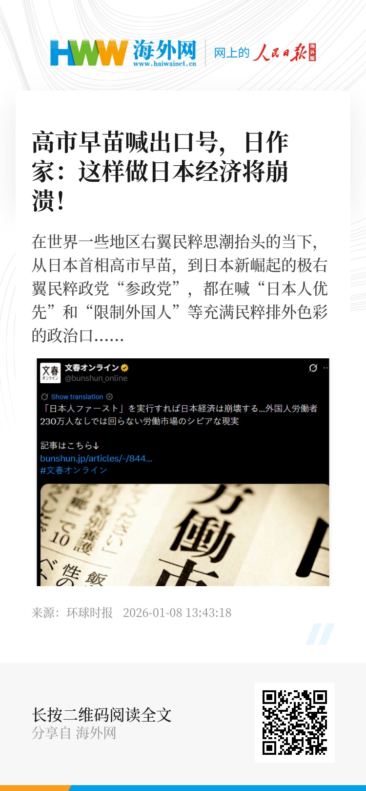 在世界一些地区右翼民粹思潮抬头的当下,从日本首相高市早苗,到日本新崛起的极右翼民粹政党“参政党”,都在喊“日本人优先”和“限制外国人”等充满民粹排外色彩的政治口号,吸引选票。