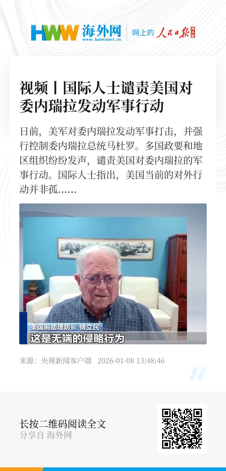 美国前助理防长 傅立民:这是无端的侵略行为,这种做法是特朗普政府超越门罗主义,在西半球推行霸权,他们认为唯一重要的主权只有美国的主权。军事行动是违反宪法的,国会没有授权对另一个国家使用武力,尤其是强制扣押另一个主权国家的总统和国家元首马杜罗。对委内瑞拉实施军事行动不但违反了美国法律,也违反了国际法中的许多规定。