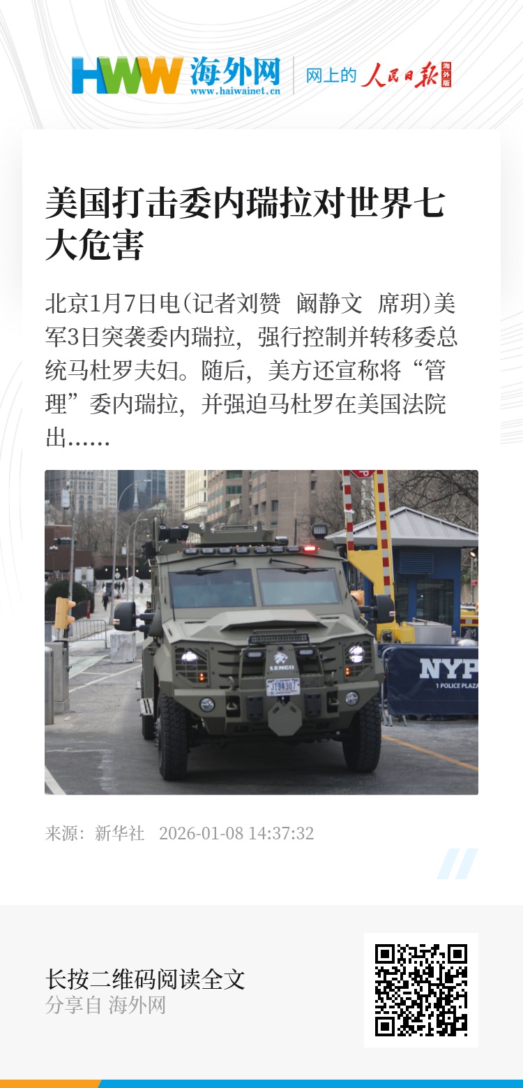 新华社北京1月7日电(记者刘赞 阚静文 席玥)美军3日突袭委内瑞拉,强行控制并转移委总统马杜罗夫妇。随后,美方还宣称将“管理”委内瑞拉,并强迫马杜罗在美国法院出庭。
