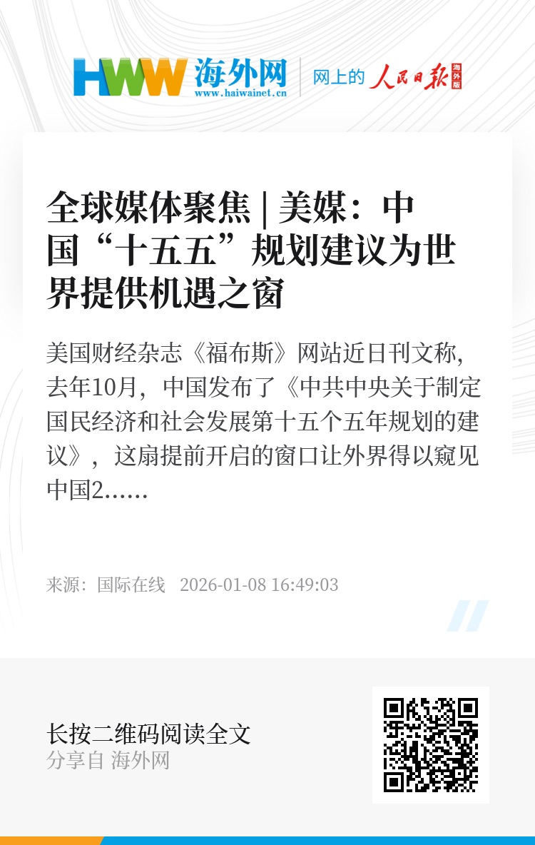 美国财经杂志《福布斯》网站近日刊文称,去年10月,中国发布了《中共中央关于制定国民经济和社会发展第十五个五年规划的建议》,这扇提前开启的窗口让外界得以窥见中国2030年的发展蓝图。同时,这份规划建议为观察中国未来五年的战略布局提供了宝贵线索。
