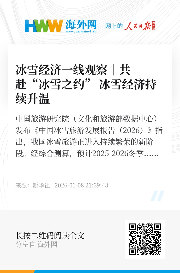 中国旅游研究院(文化和旅游部数据中心)发布《中国冰雪旅游发展报告(2026)》指出,我国冰雪旅游正进入持续繁荣的新阶段。
