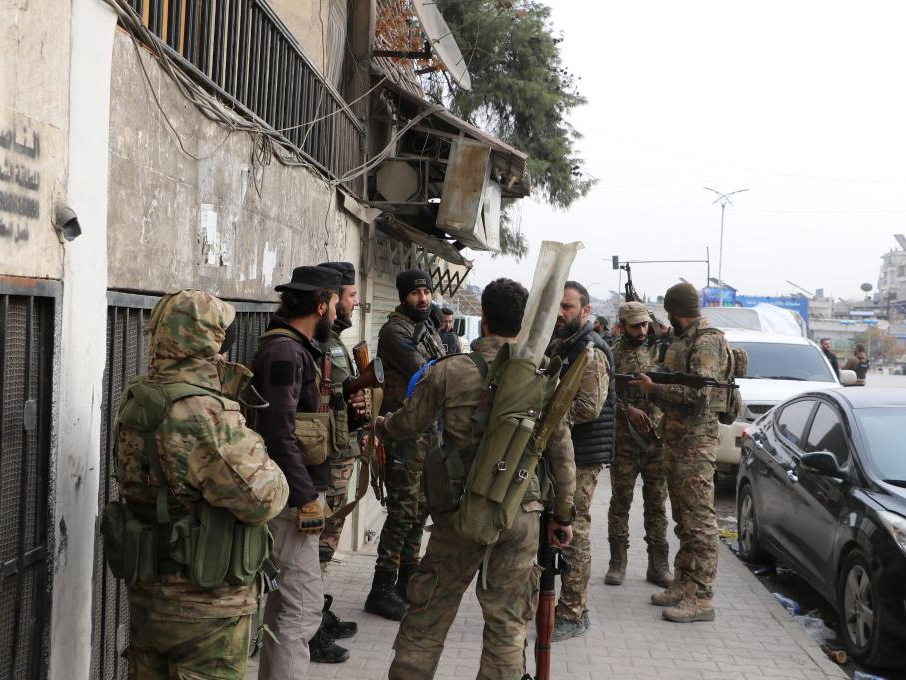 1月8日,在叙利亚阿勒颇市,叙过渡政府士兵在交流。新华社发