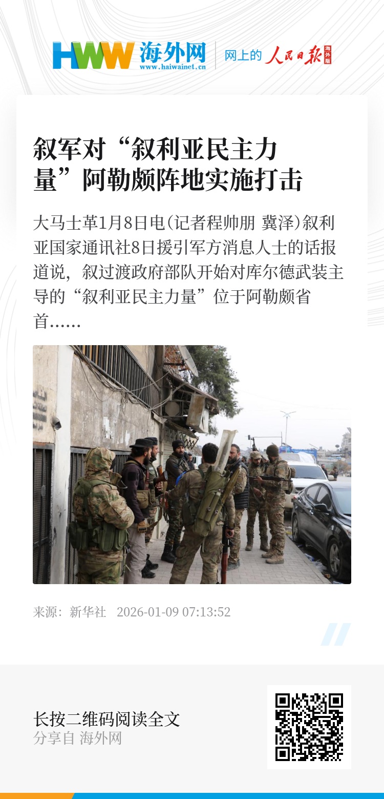 新华社大马士革1月8日电(记者程帅朋 冀泽)叙利亚国家通讯社8日援引军方消息人士的话报道说,叙过渡政府部队开始对库尔德武装主导的“叙利亚民主力量”位于阿勒颇省首府阿勒颇市的阵地实施猛烈而有针对性的打击。