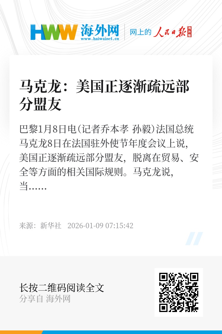 新华社巴黎1月8日电(记者乔本孝 孙毅)法国总统马克龙8日在法国驻外使节年度会议上说,美国正逐渐疏远部分盟友,脱离在贸易、安全等方面的相关国际规则。
