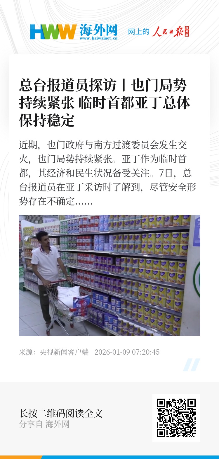 近期,也门政府与南方过渡委员会发生交火,也门局势持续紧张。亚丁作为临时首都,其经济和民生状况备受关注。7日,总台报道员在亚丁采访时了解到,尽管安全形势存在不确定性,但当地物资供应、商业活动和公共服务等方面整体运行平稳,未出现明显异常。