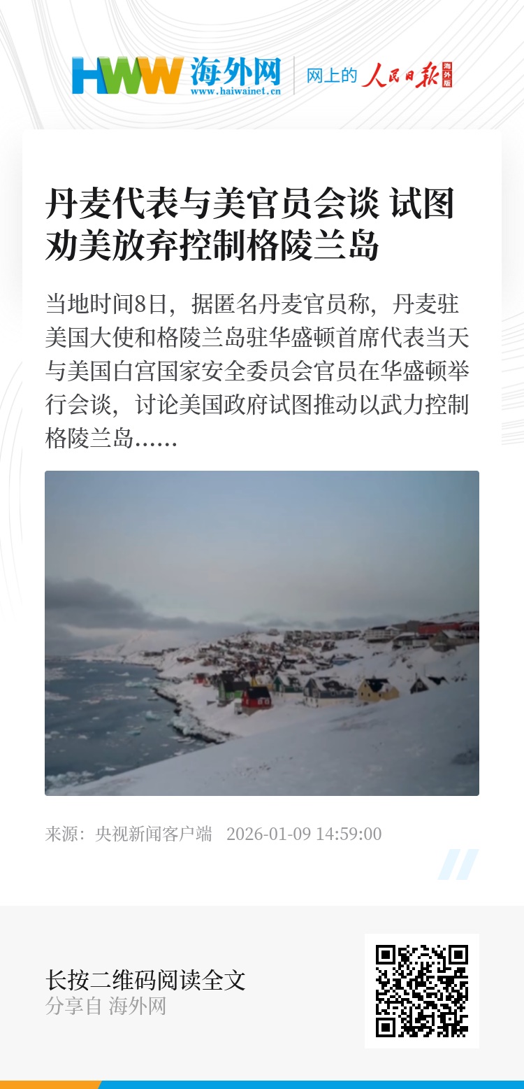当地时间8日,据匿名丹麦官员称,丹麦驻美国大使和格陵兰岛驻华盛顿首席代表当天与美国白宫国家安全委员会官员在华盛顿举行会谈,讨论美国政府试图推动以武力控制格陵兰岛一事。