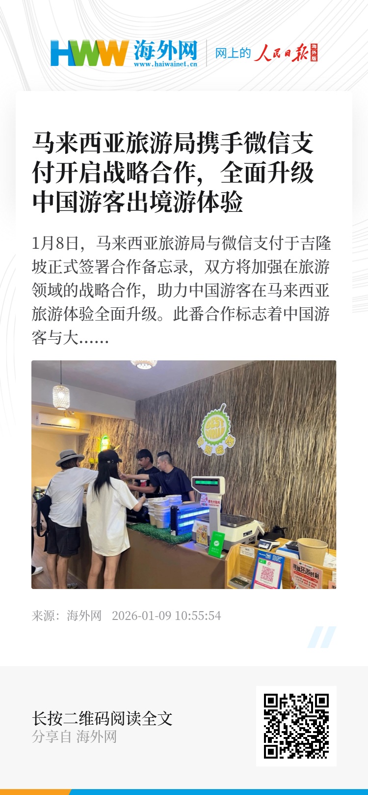 1月8日,马来西亚旅游局与微信支付于吉隆坡正式签署合作备忘录,双方将加强在旅游领域的战略合作,助力中国游客在马来西亚旅游体验全面升级。此番合作标志着中国游客与大马的支付环境和旅游服务进一步“无缝衔接”,从知名商圈到街头小店,通过微信轻松实现一“码”畅游。