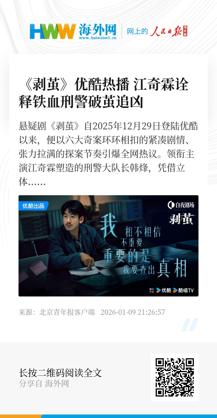 悬疑剧《剥茧》自2025年12月29日登陆优酷以来,便以六大奇案环环相扣的紧凑剧情、张力拉满的探案节奏引爆全网热议。领衔主演江奇霖塑造的刑警大队长韩烽,凭借立体饱满的人设成为剧集点睛之笔。