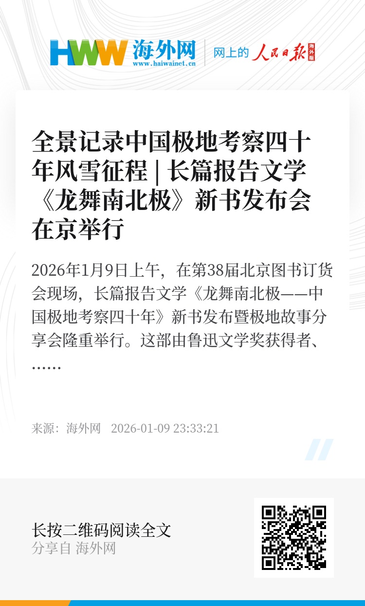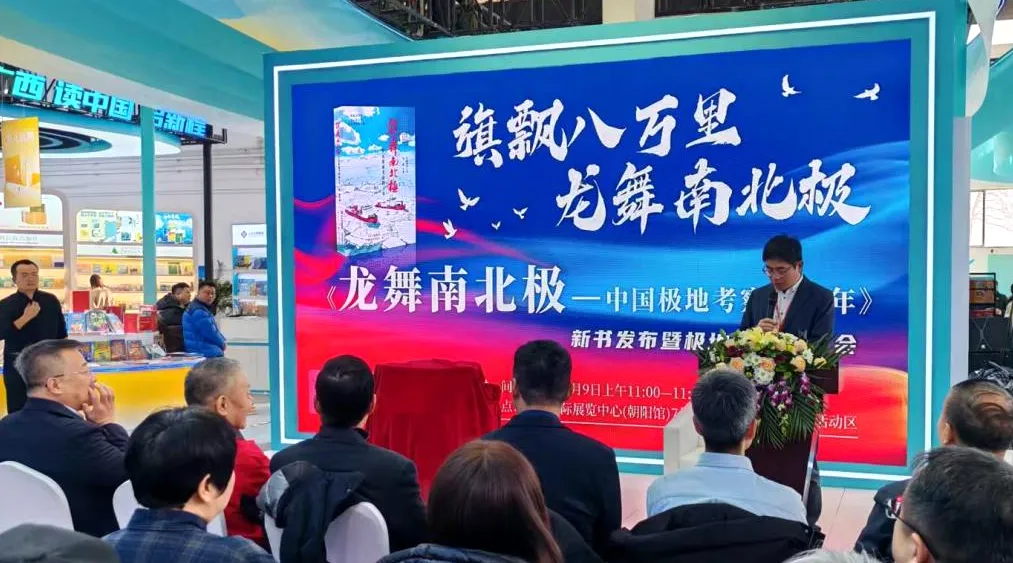 2026年1月9日上午,在第38届北京图书订货会现场,长篇报告文学《龙舞南北极——中国极地考察四十年》新书发布暨极地故事分享会隆重举行。这部由鲁迅文学奖获得者、著名作家许晨历经数年精心采写、青岛出版社与百花文艺出版社联合出版的作品,首度以全景式文学笔法,再现中国极地考察事业四十年的壮丽史诗。