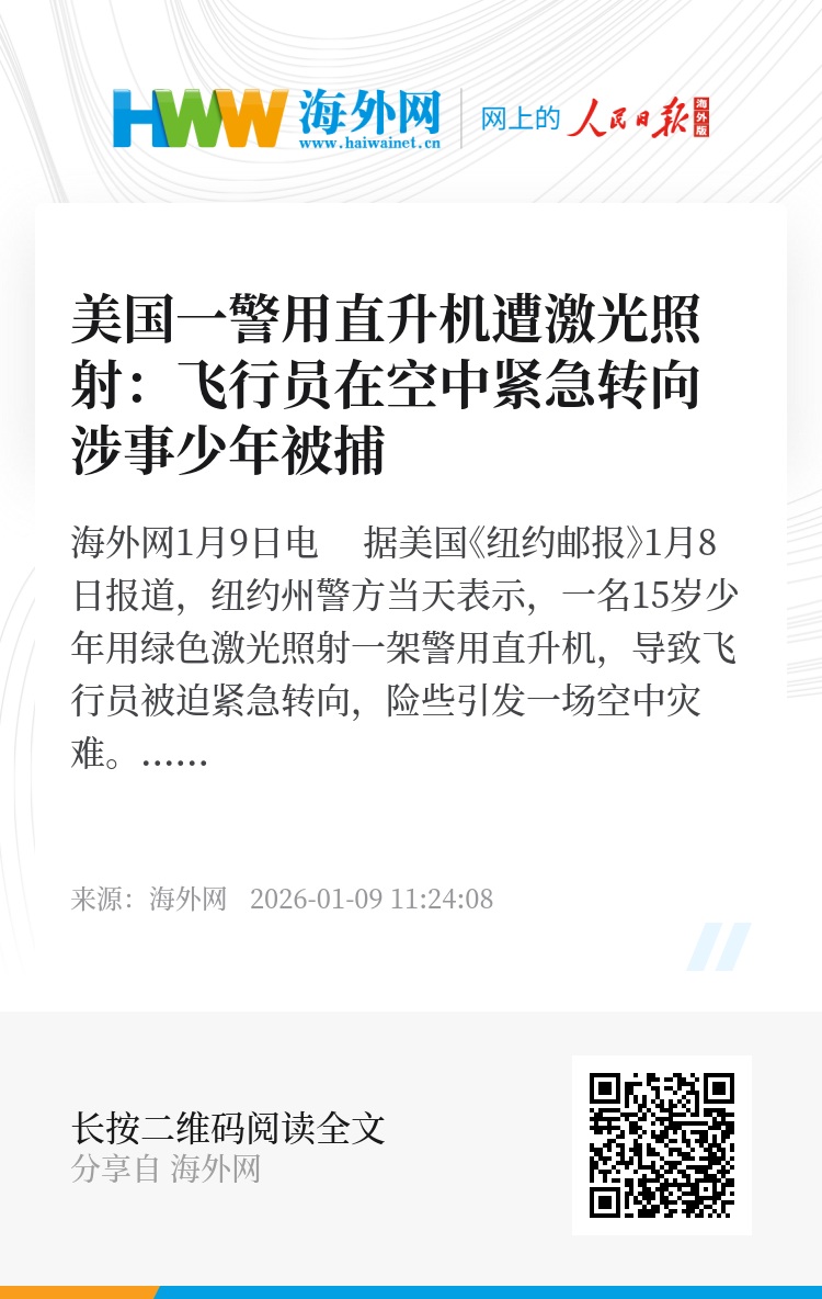 海外网1月9日电 据美国《纽约邮报》1月8日报道,纽约州警方当天表示,一名15岁少年用绿色激光照射一架警用直升机,导致飞行员被迫紧急转向,险些引发一场空中灾难。