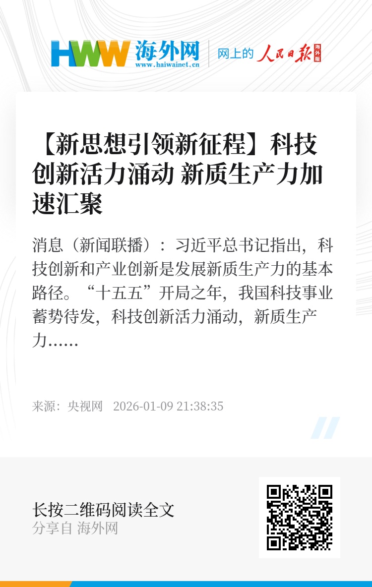 央视网消息(新闻联播):习近平总书记指出,科技创新和产业创新是发展新质生产力的基本路径。“十五五”开局之年,我国科技事业蓄势待发,科技创新活力涌动,新质生产力加速汇聚,为推动高质量发展注入强劲动能。