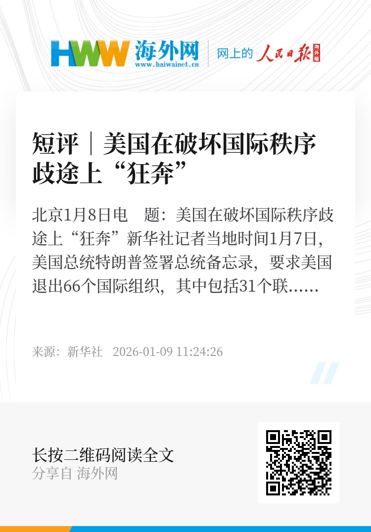如果说入侵委内瑞拉、用暴力践踏国际法尊严,是在“违法”;那么此次“批量”退出国际组织,冲击全球治理的制度基石,则是在“毁约”。一手挥舞军事大棒践踏主权,一手动用行政指令对多边机制釜底抽薪,这种“违法”与“毁约”并行的非理性行径表明,美国已成为现有国际秩序“失控的超级破坏者”,妄图将世界拖回弱肉强食的“丛林时代”。