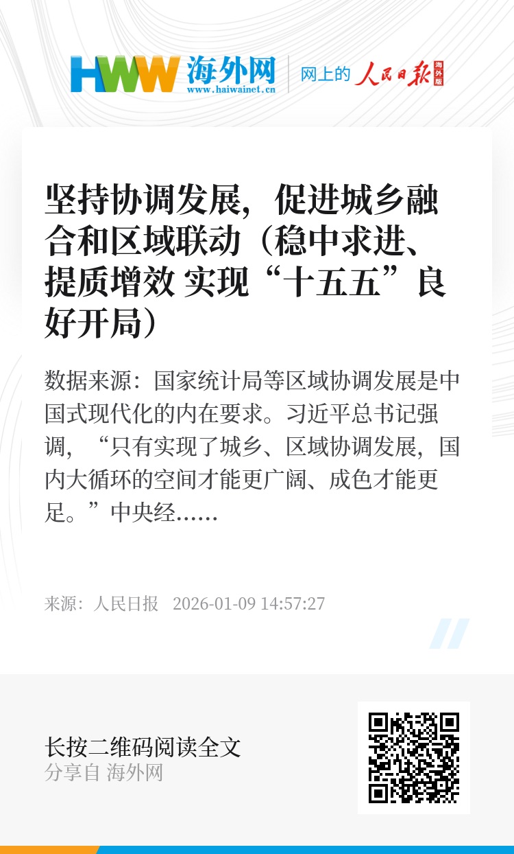 蓝图已绘就,奋进正当时。坚持系统思维,全面推进城乡、区域协调发展,进一步畅通工农城乡循环,持续增强经济韧性和战略纵深,必将为实现中国式现代化积蓄强大势能。(记者 郁静娴)