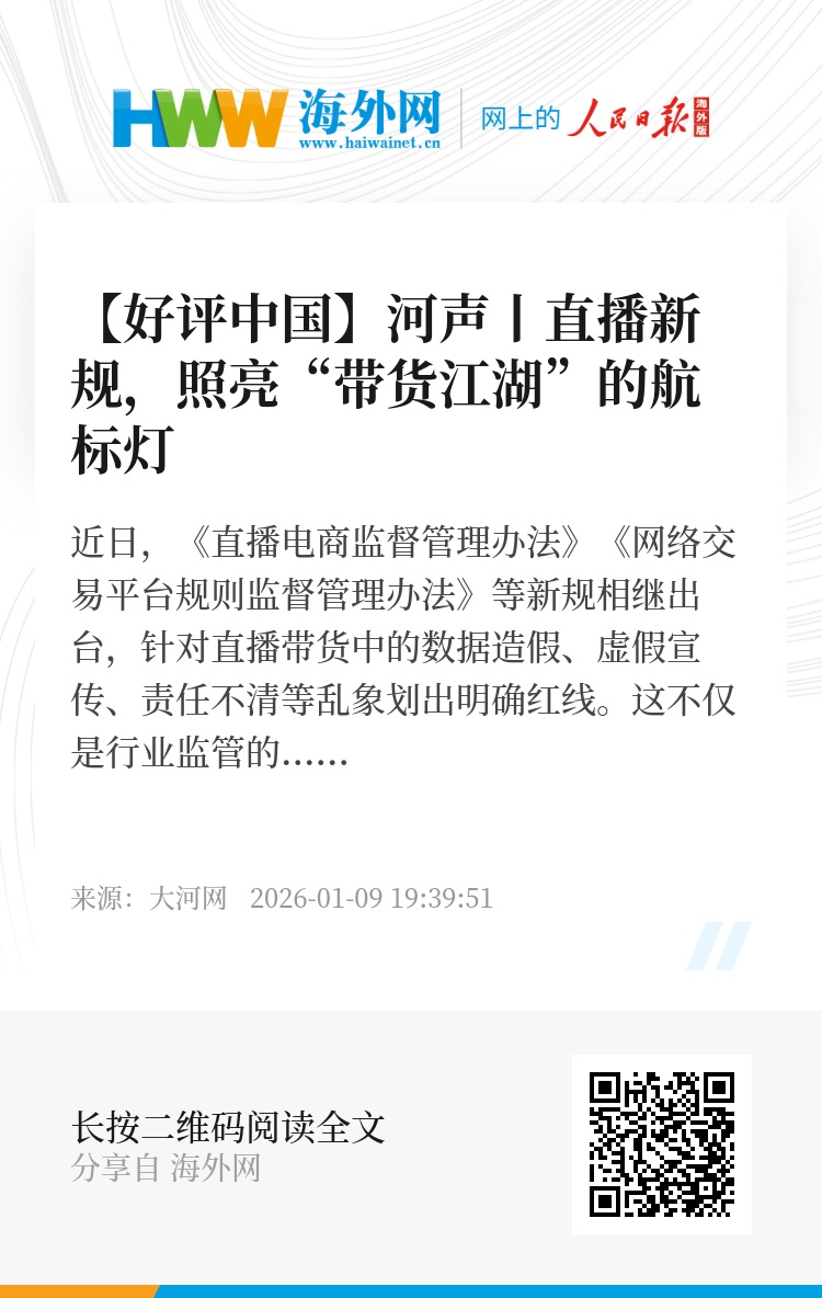 规范是为了更好的发展。这套新规,如同为疾驰的直播电商列车亮起清晰的信号灯与架起稳固的轨道。它照亮前路,也划出底线,其最终目的,是让消费者买得放心,让诚信者行得顺畅,让这个充满活力的新兴业态真正成为推动消费升级、促进社会信任建设的正能量。(大河网河声评论员 王志高)