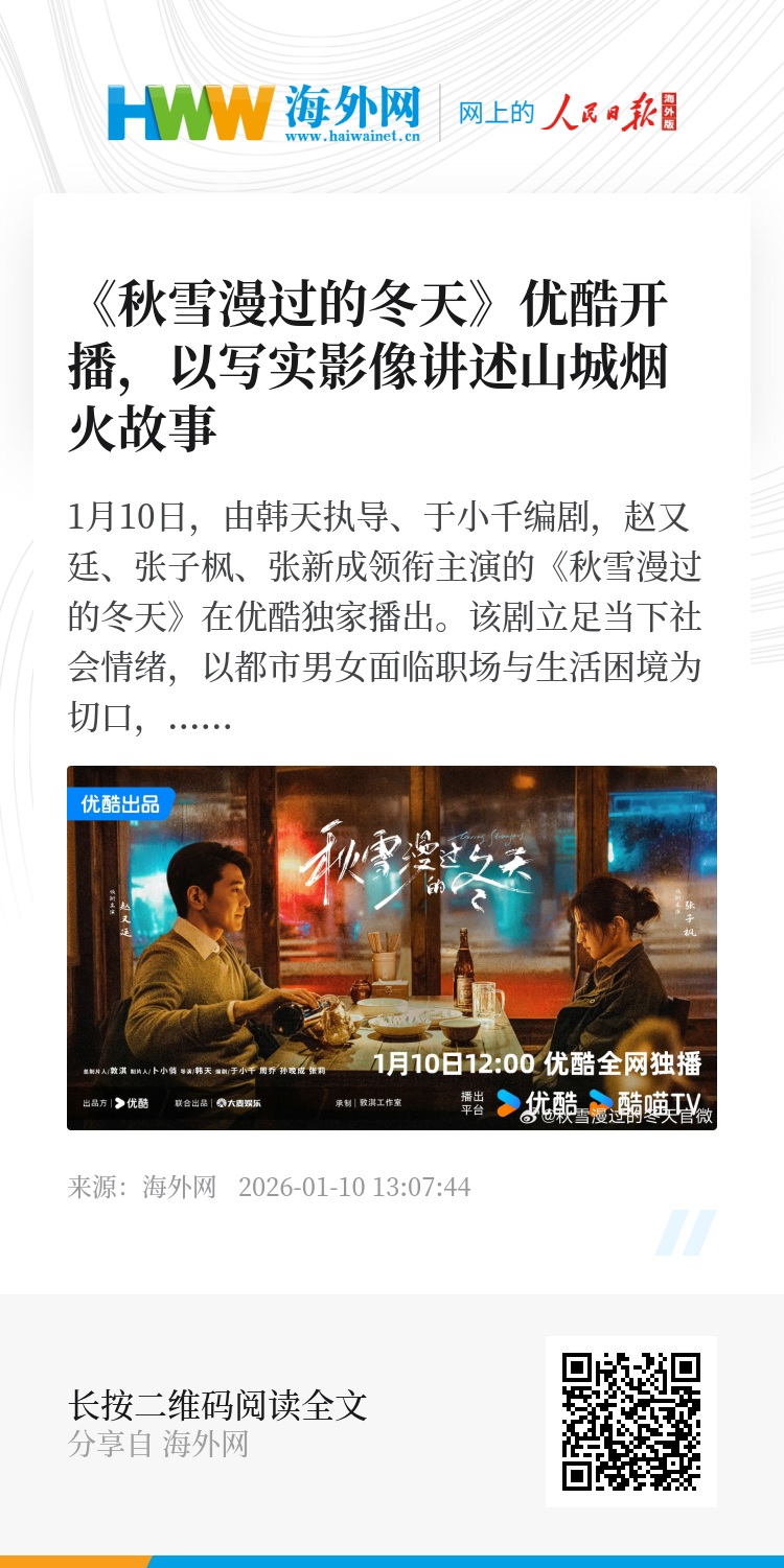 1月10日,由韩天执导、于小千编剧,赵又廷、张子枫、张新成领衔主演的《秋雪漫过的冬天》在优酷独家播出。该剧立足当下社会情绪,以都市男女面临职场与生活困境为切口,以平凡人相互扶持、彼此疗愈为创作核心,传递向上向善的价值观。全剧在重庆实地取景,通过长江索道、穿楼轻轨、市井火锅等城市符号,生动展现山城烟火气。
