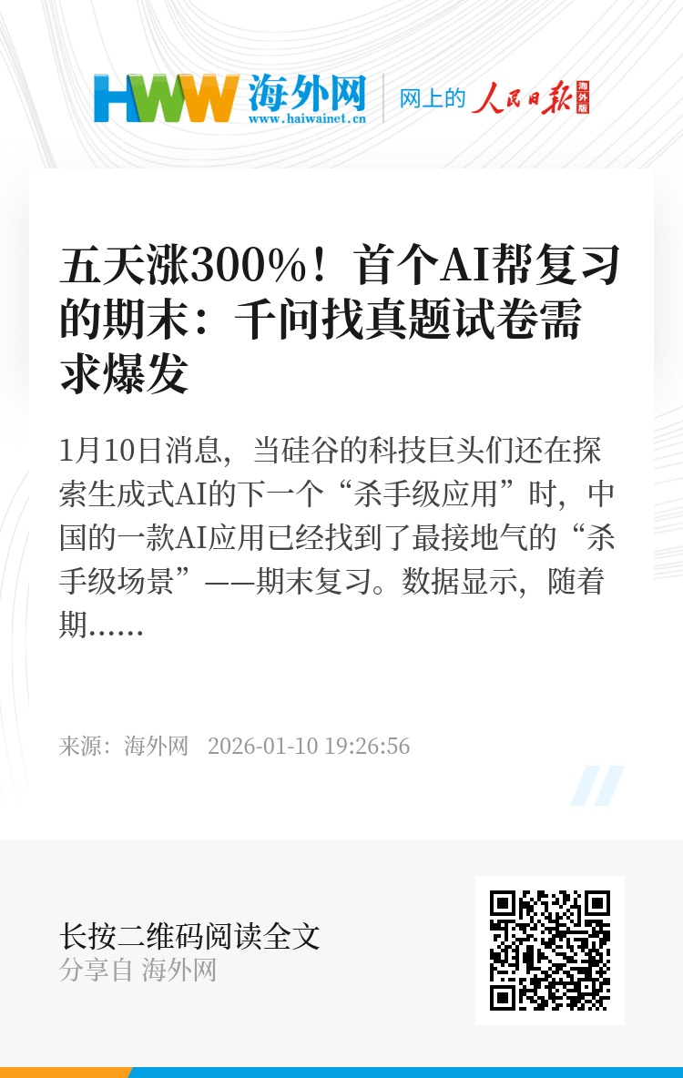 1月10日消息,当硅谷的科技巨头们还在探索生成式AI的下一个“杀手级应用”时,中国的一款AI应用已经找到了最接地气的“杀手级场景”——期末复习。数据显示,随着期末复习进入高峰,千问APP学习相关能力的调用量再创新高,周环比增长超100%。其中,找真题试卷的需求尤为火热,短短五天内激增超300%“在千问一句话找卷子”正成为风潮蔓延。