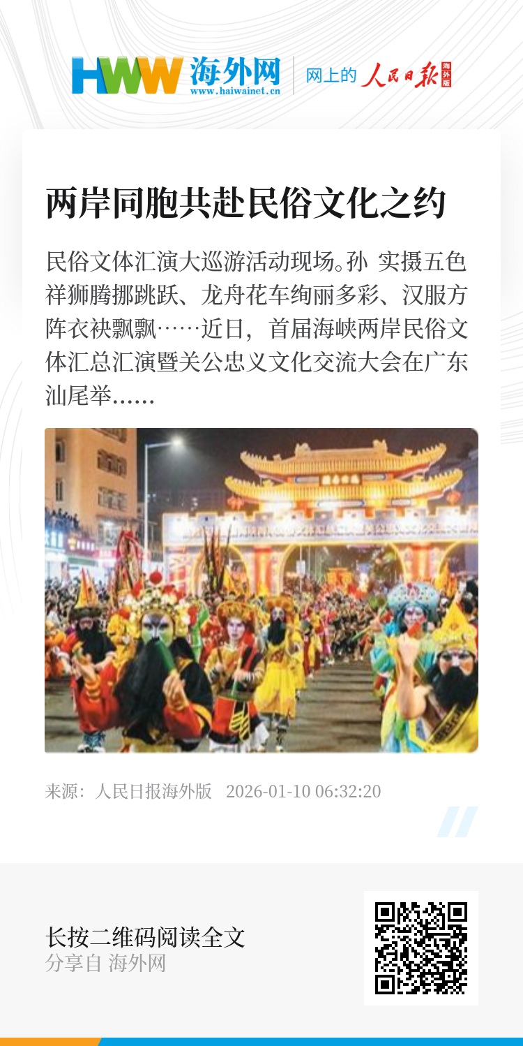 据悉,2026年第二届海峡两岸民俗文体汇将由广东汕尾、潮州、河源、湛江、阳江、茂名等6个地市共同承办,续写两岸文化交流、融合发展的新篇章。
