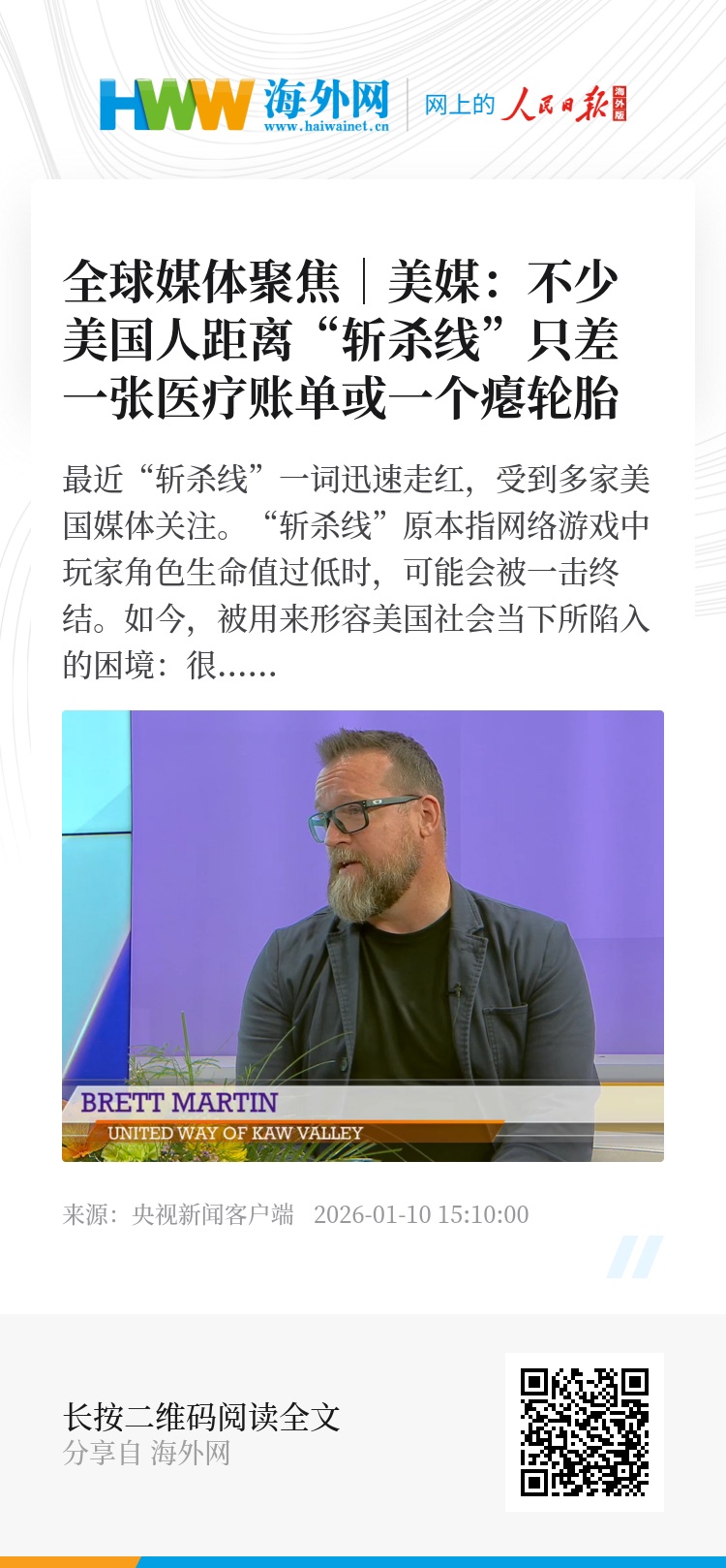 最近“斩杀线”一词迅速走红,受到多家美国媒体关注。“斩杀线”原本指网络游戏中玩家角色生命值过低时,可能会被一击终结。如今,被用来形容美国社会当下所陷入的困境:很多美国人群尽管有固定收入,但一旦遭遇一个突发事件,如失业、重病,就可能坠入深渊。