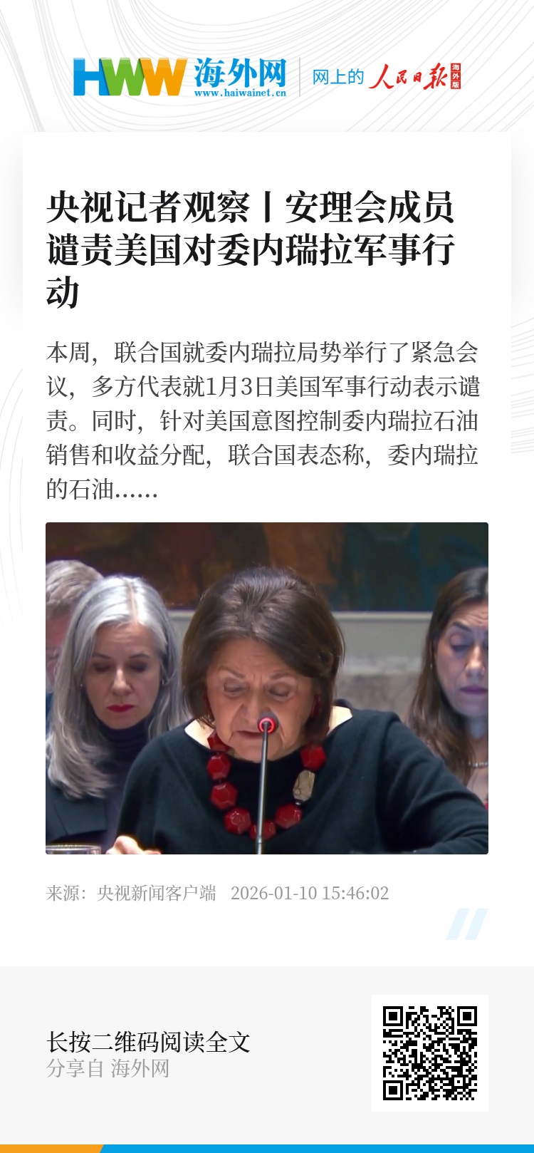 联合国副秘书长 罗斯玛丽·迪卡洛:我一直强调,各方都必须充分尊重国际法,包括作为维护国际和平与安全基石的《联合国宪章》。我仍然对1月3日的军事行动未能遵守国际法规则表示深切关切。