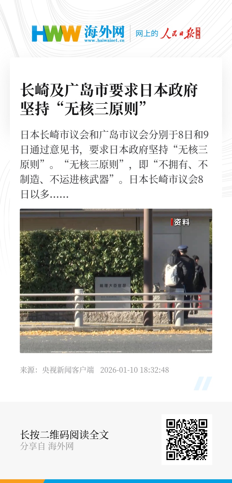 日本长崎市议会和广岛市议会分别于8日和9日通过意见书,要求日本政府坚持“无核三原则”。“无核三原则”,即“不拥有、不制造、不运进核武器”。
