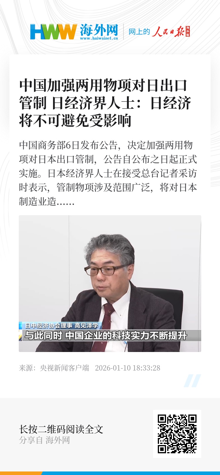 日中经济协会理事 高见泽学:坦率说,日本经济界最担心的是这一措施是否会对日本企业经营造成重大影响,尤其是半导体等高端制造领域很可能会首先受到冲击。短期内日本企业或许还能依靠库存应对,但从中长期看,制造环节不可避免会受到影响。
