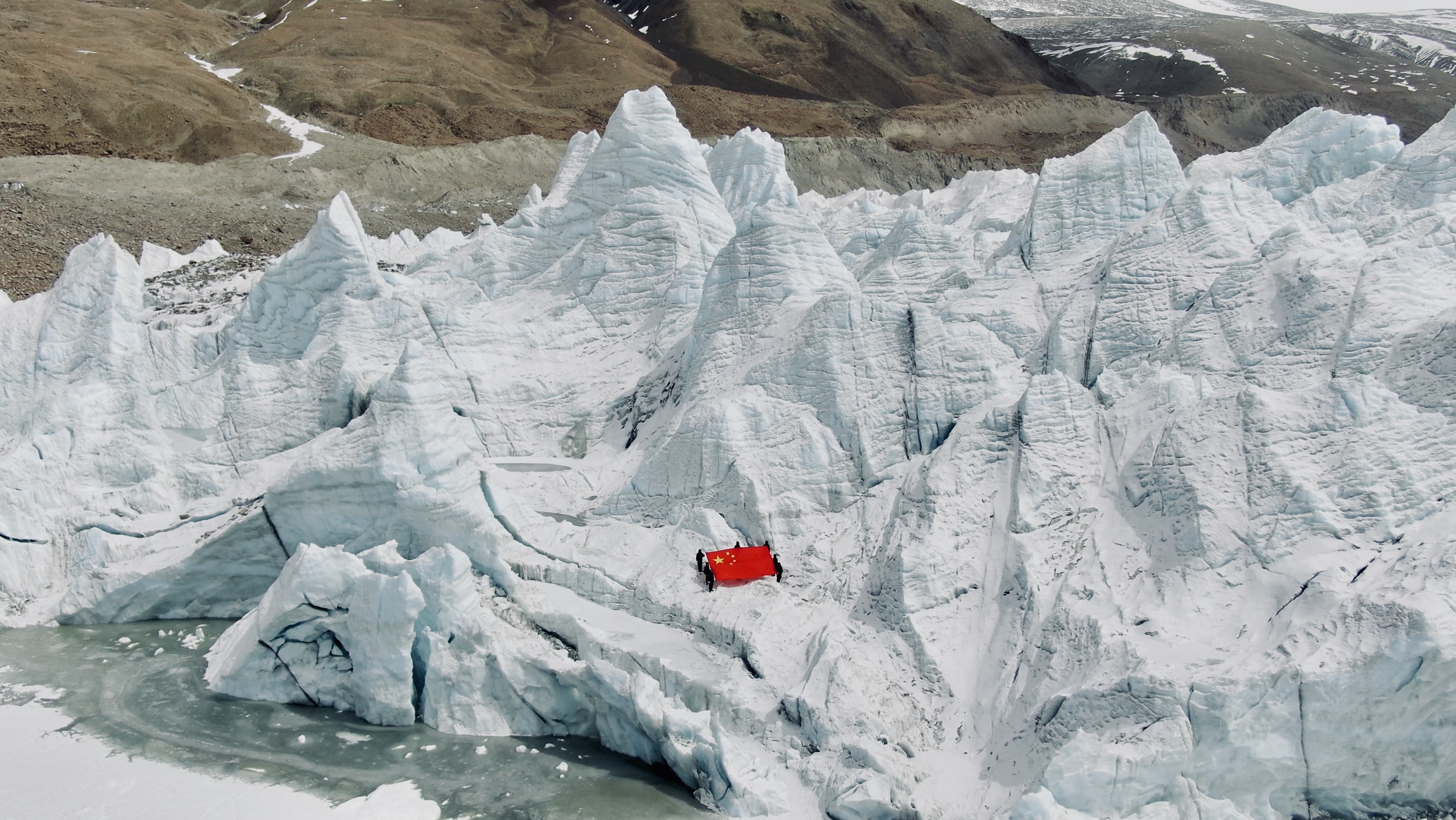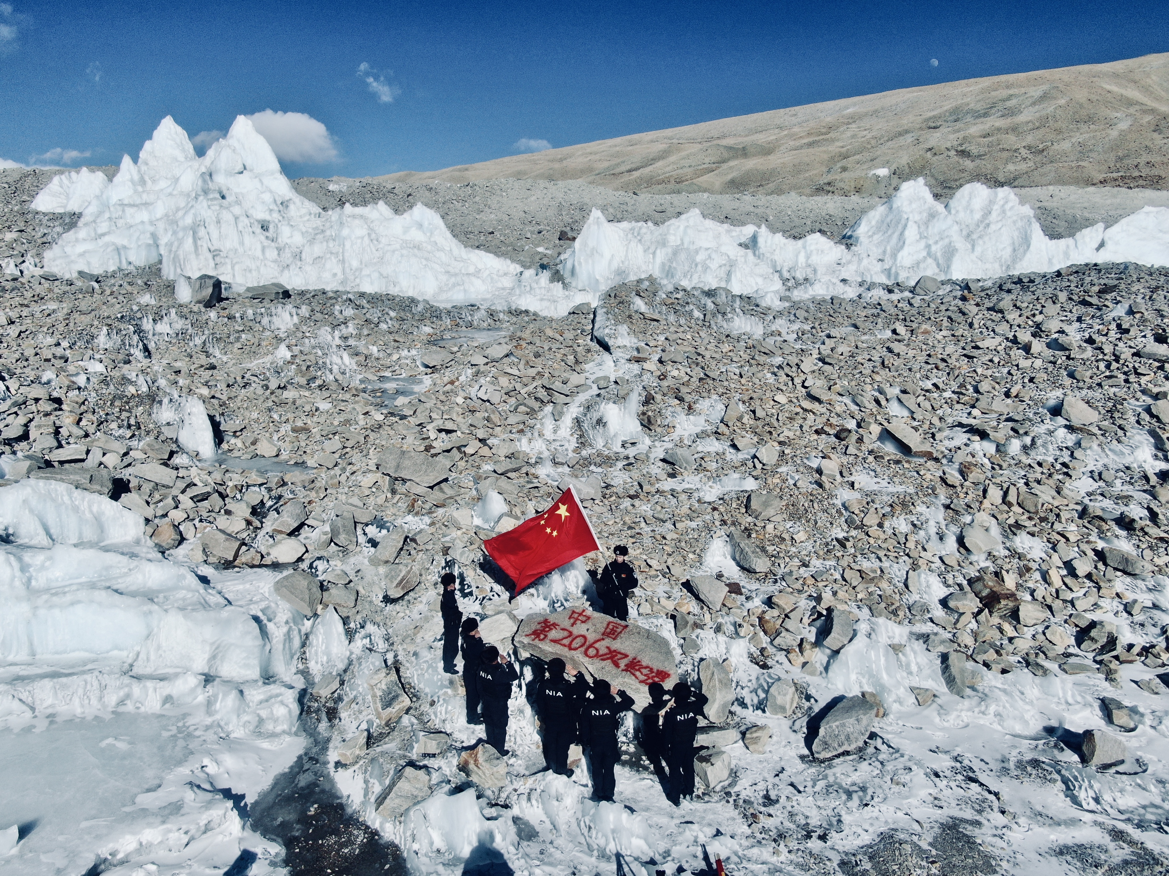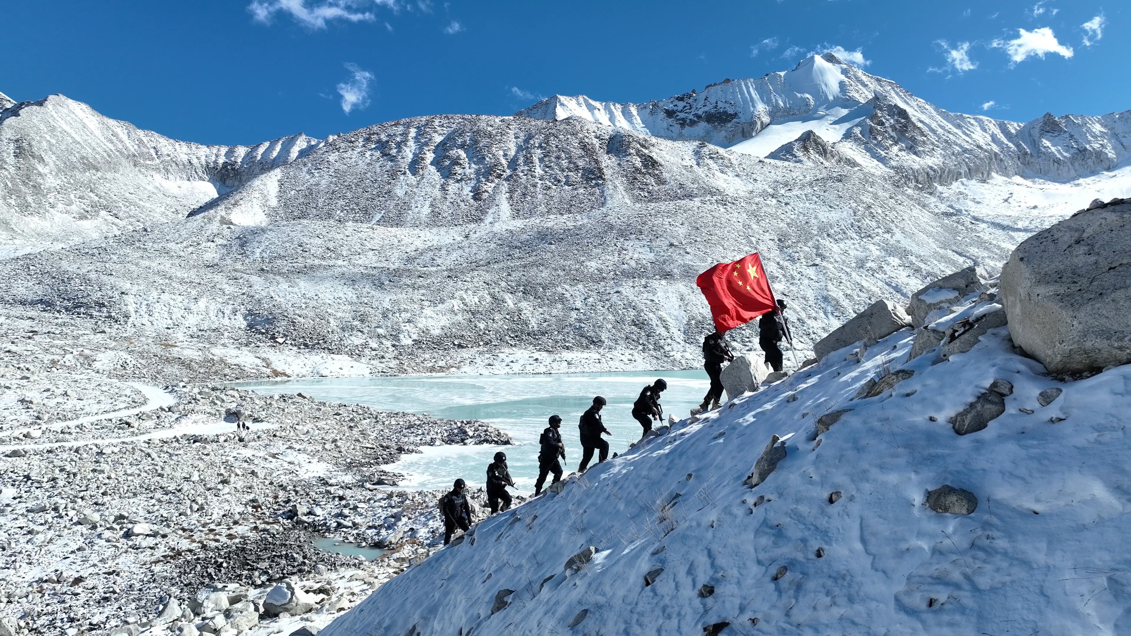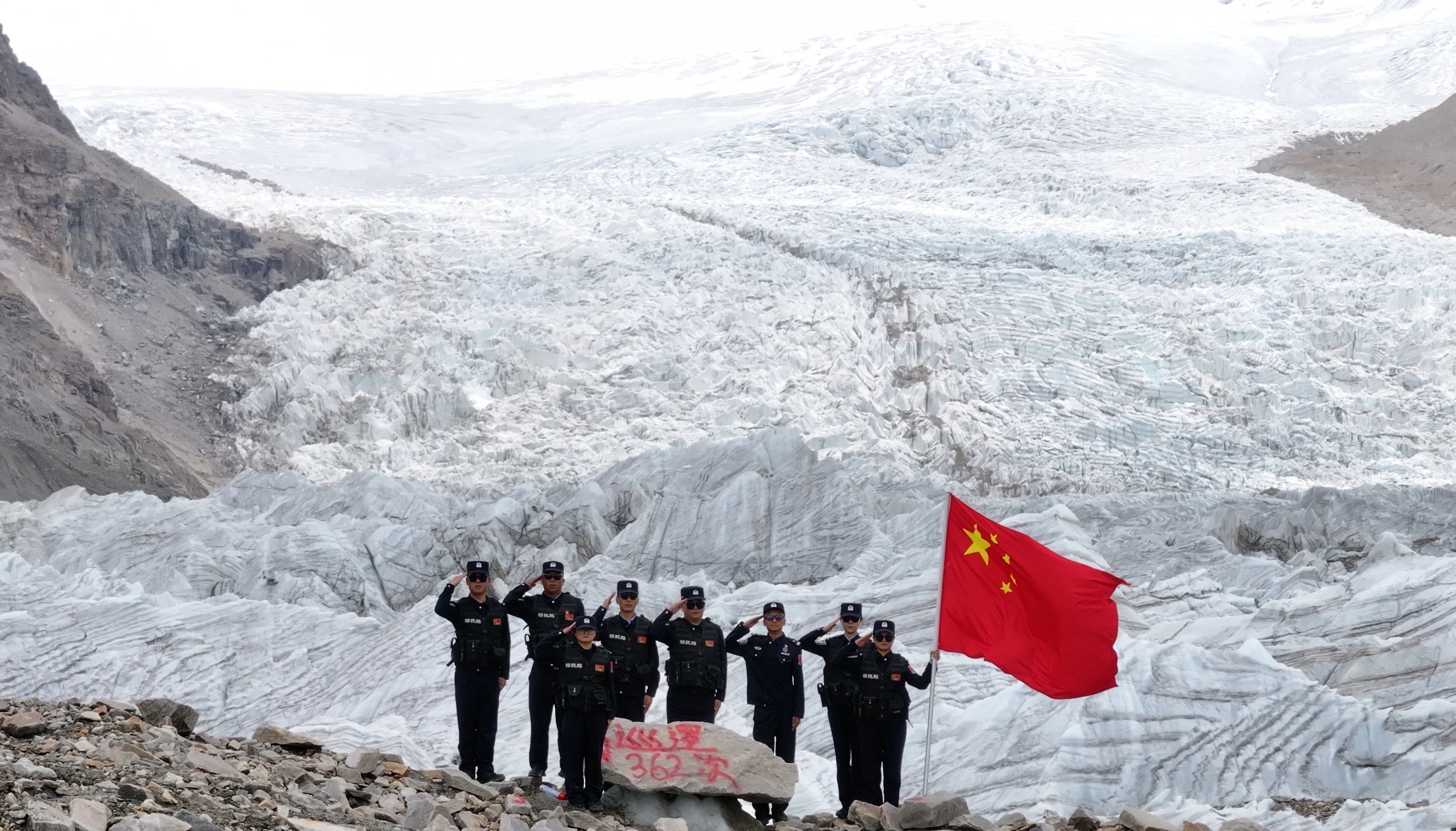 每天清晨6点,3人准时起床,在严重缺氧的环境中完成内务整理和巡逻准备。冬季室外温度低至零下20度以下,积雪深达1米,寒风呼啸着能把人吹倒,她们背着10公斤的装备徒步巡查边境线,每一步都像踩在棉花上。去年7月,她们接到游客报警,有车辆和人员被困前往岗布冰川的无人区,在零下20度的寒风中搜寻了5小时,最终成功解救遇险者。在巡逻中不边境海拔达5600米的岗布冰川时,她们必须用绳索将彼此相连,在冰峰与裂缝间艰难前行,并在冰川旁的石头上用油漆喷绘"中国"字样,让红色的光芒在风雪中闪耀。