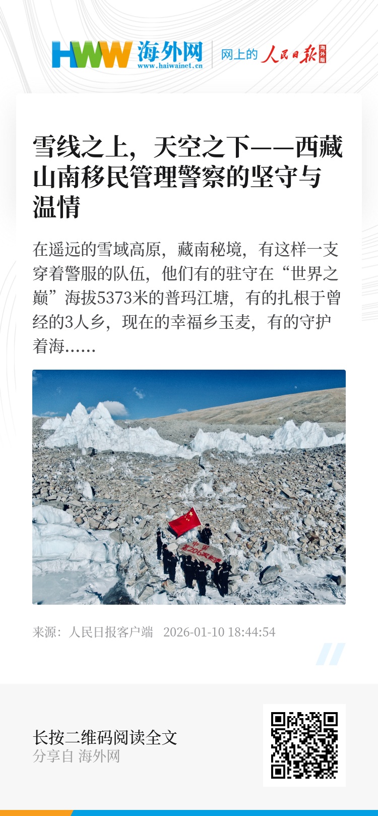 在遥远的雪域高原,藏南秘境,有这样一支穿着警服的队伍,他们有的驻守在“世界之巅”海拔5373米的普玛江塘,有的扎根于曾经的3人乡,现在的幸福乡玉麦,有的守护着海拔7538米的库拉岗日峰,他们都拥有一个共同的名字——西藏山南移民管理警察,他们常年驻守在这里,用忠诚与担当守护着祖国西南边陲的一寸寸土地,用青春和热血诠释着“人民公安为人民”的铮铮誓言,在这雪线之上,蓝天之下,书写着一个个感人至深的戍边故事。