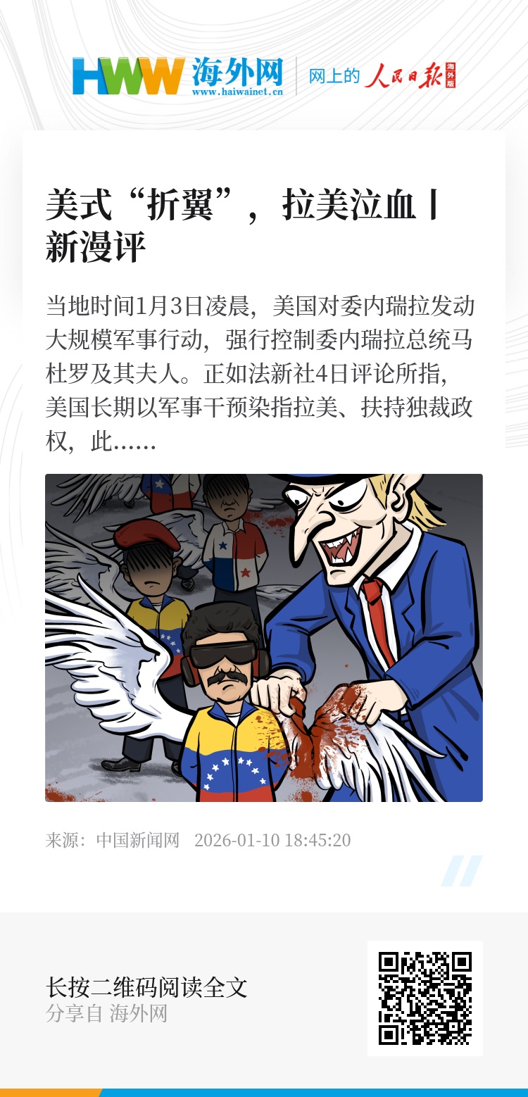 当地时间1月3日凌晨,美国对委内瑞拉发动大规模军事行动,强行控制委内瑞拉总统马杜罗及其夫人。正如法新社4日评论所指,美国长期以军事干预染指拉美、扶持独裁政权,此次借所谓“毒品恐怖主义”之名行不义之举,背后藏着多重算盘:觊觎委内瑞拉庞大石油储备、推翻其左翼政府,以及推进“重返西半球”的地缘战略。