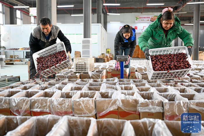 ↑ 在新疆和田地区墨玉县,新疆自由落体网络科技有限公司的工作人员将红枣装箱(1月9日摄)。
