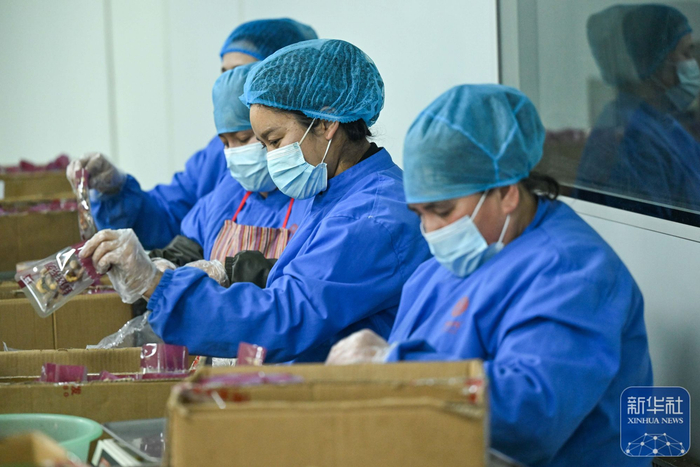 ↑ 在新疆和田地区墨玉县,新疆阿布丹食品开发有限公司的员工在包装干果产品(1月9日摄)。