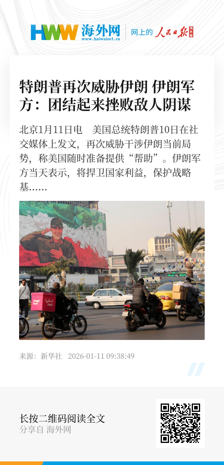 新华社北京1月11日电 美国总统特朗普10日在社交媒体上发文,再次威胁干涉伊朗当前局势,称美国随时准备提供“帮助”。伊朗军方当天表示,将捍卫国家利益,保护战略基础设施和公共财产,并敦促伊朗人民团结起来“挫败敌人的阴谋”。
