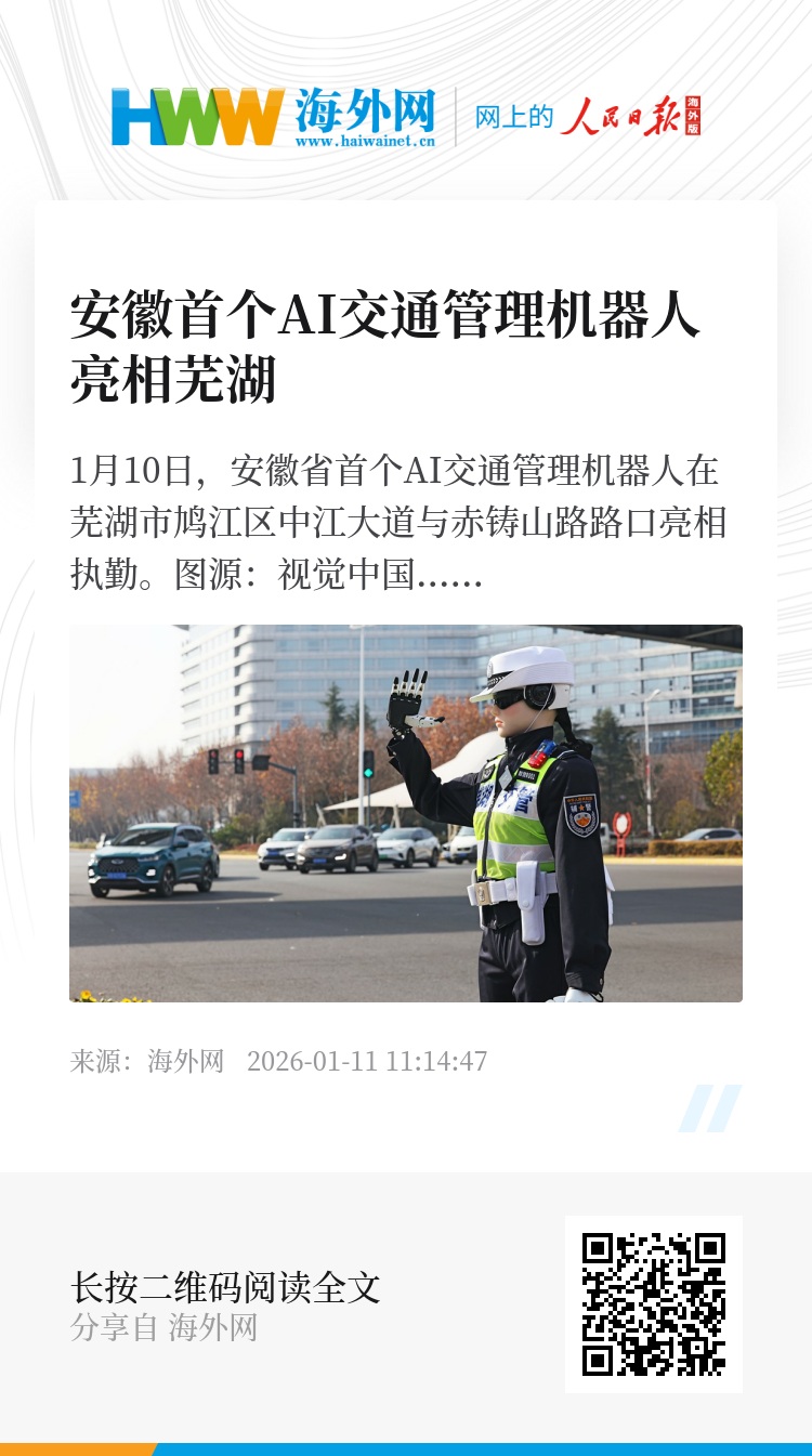 32922702,.安徽首个AI交通管理机器人亮相芜湖,.2026-01-11 11:14:47,.204589,.黄之安、陈亚楠