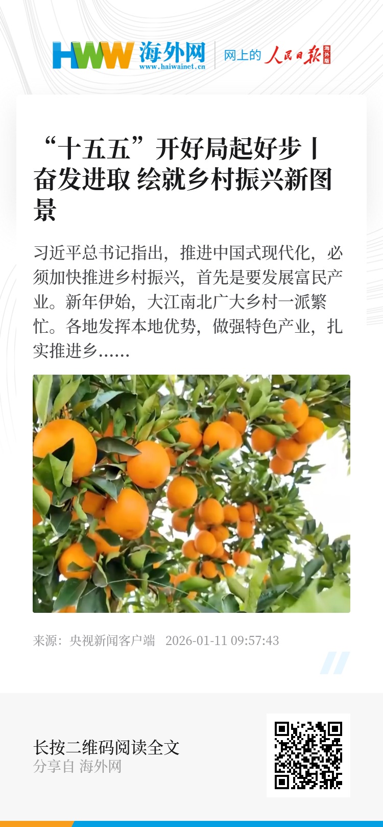 重庆万州国家现代农业产业园里,十万亩柑橘丰收了。这边村民忙着采摘,15公里外的加工车间里,鲜果正在变成果汁。新的一年,围绕柑橘这一主导产业,园区将在绿色加工、生态品牌等方面发力,力争总产值突破100亿元。
